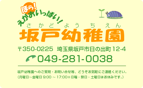 学校法人 坂戸幼稚園 〒350-0225 埼玉県坂戸市日の出町12-4 TEL:049-281-0038/E-mail:sakayou@poppy.ocn.ne.jp