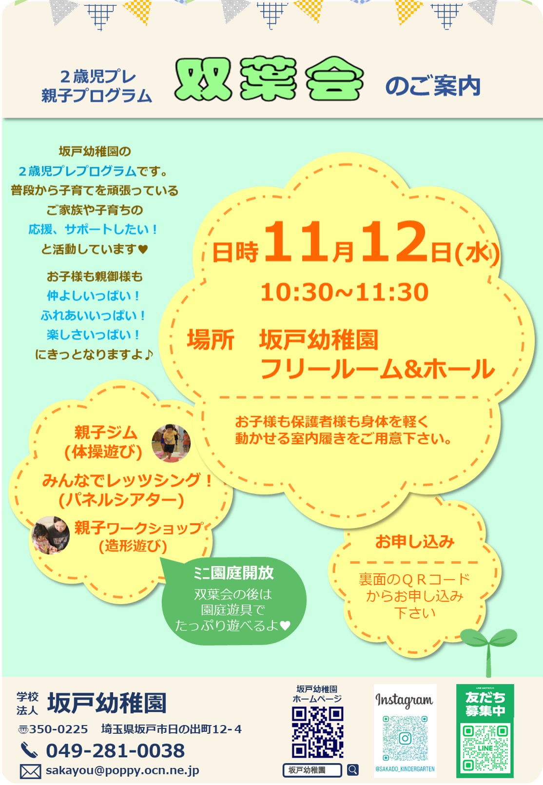 投稿が遅くなってしまいました・・・。11月26日(水)に双葉会がありましたよ。双葉会のスタートから早や7ヶ月が経ち、あれまあこんなこともできるようになったの!?おやおやいつの間にこんなに上手になったの!?と子どもたち自身も親御様も成長を感じられるようになりましたね。インフルエンザでちょっと少ない人数でしたが、その分ほんわかと和気あいあいの時間になりました!
