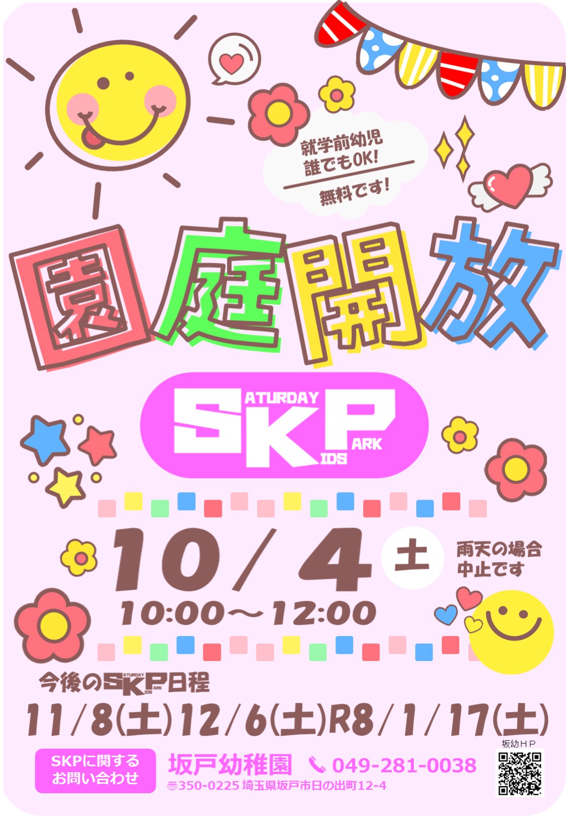 今日10月4日(土)は園庭開放SKPの日です!ですが・・・雨雲レーダーではちょうどSKPの時間帯に坂戸市上空に被ってくる予報になっています。もしかいたしましたらお越しいただいたのに中止、途中からお戻りいただくことにもなりかねないませんが、確率は40%ですので遊びに来てくれたお子様をお迎えする準備をしてお待ちしています!※なお、1歳児親子ひろば「そらまめ」は室内での活動になりますので行いますよ!